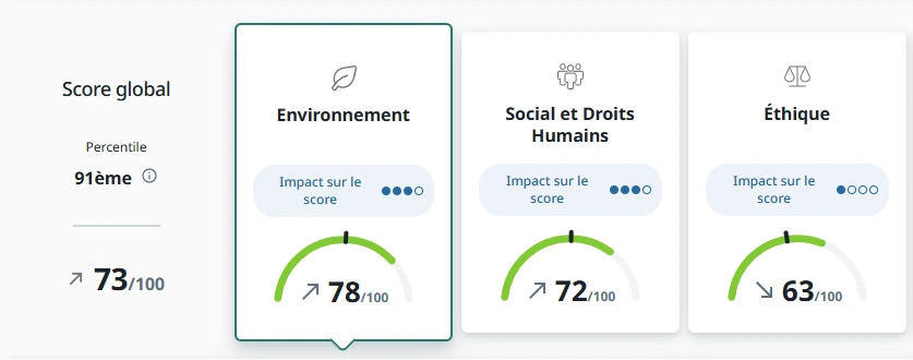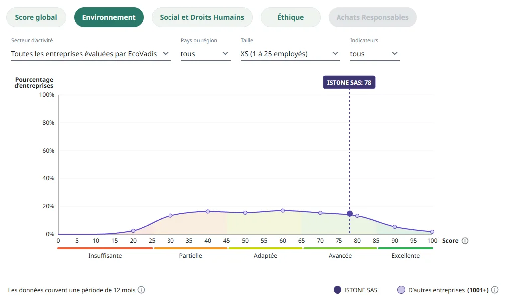 Les résultats sont à la hauteur de notre implication : en 2025, iStone a obtenu la médaille d’argent avec un score remarquable de 73/100. Ce score nous place fièrement dans le top 9% des entreprises de notre secteur évaluées par EcoVadis.