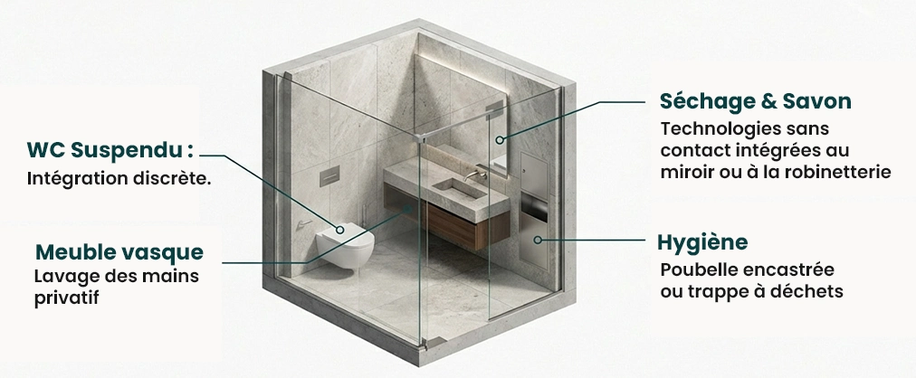 L’objectif architectural : Offrir à l’utilisateur un environnement « Home away from home » (comme à la maison), où l’intimité est totale et l’hygiène maîtrisée de A à Z.